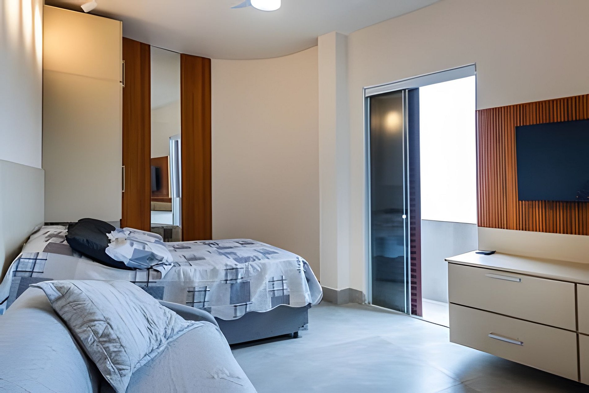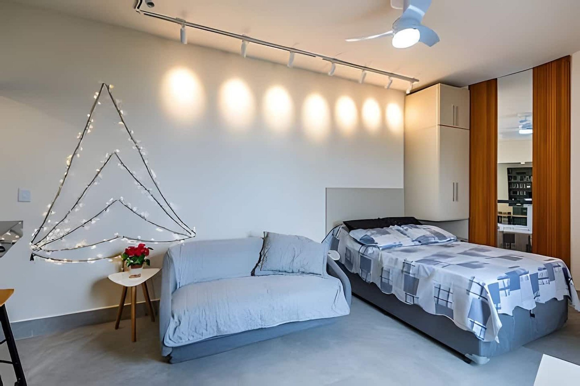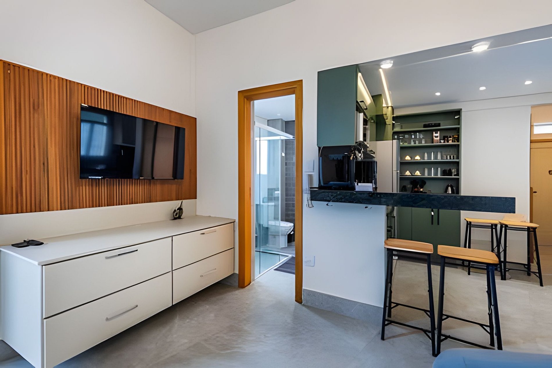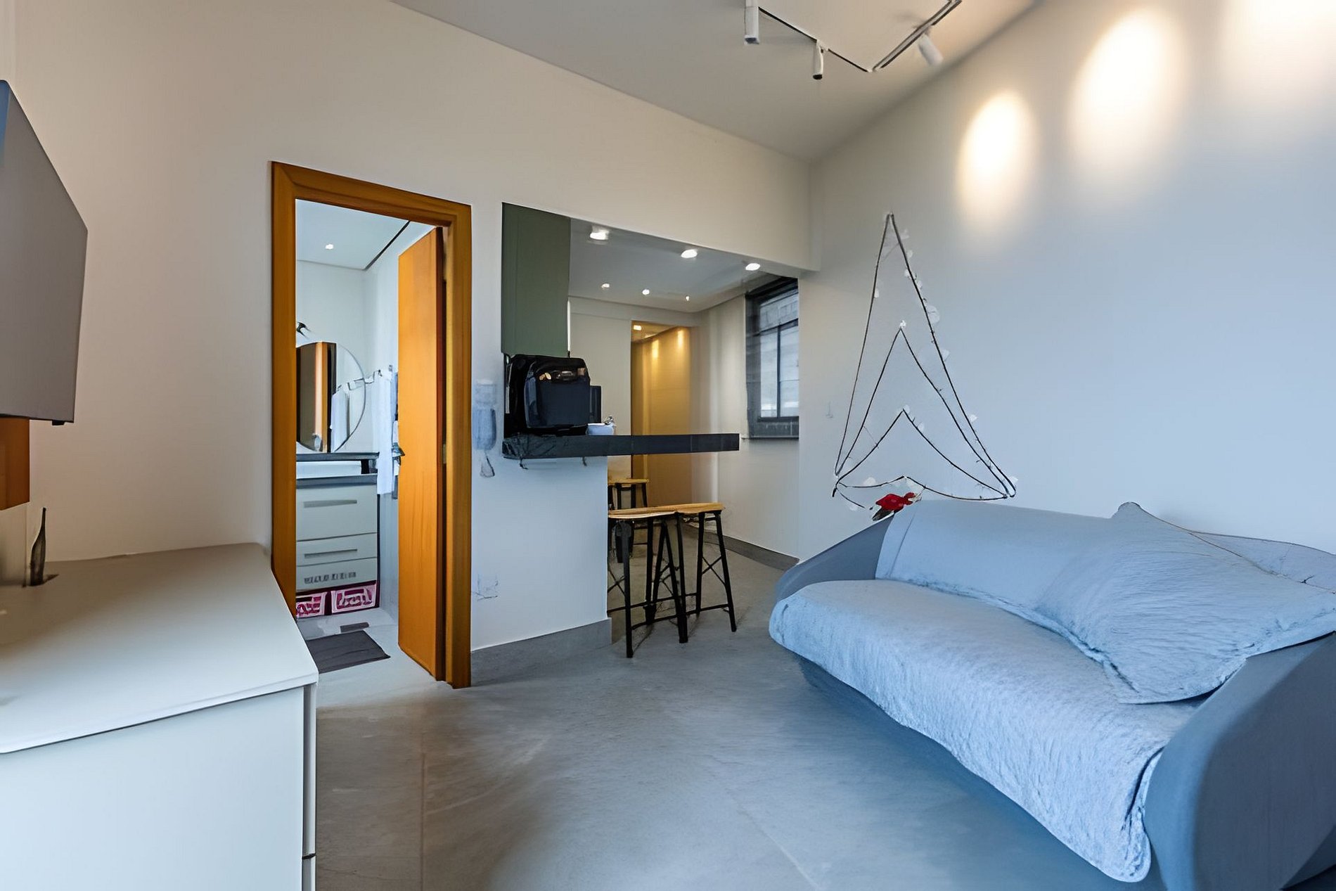 Na área de TV, o sofá-cama tem tamanho de cama de casal. A TV é Smart, pega também canais abertos e possuí suporte articulado, permitindo assistir da cama ou da cozinha.