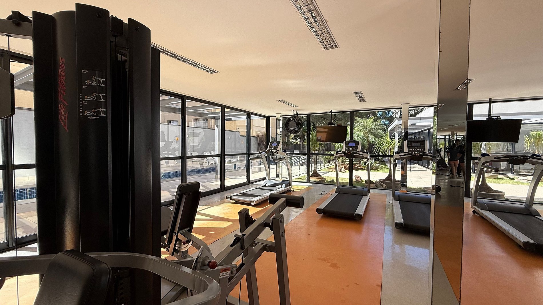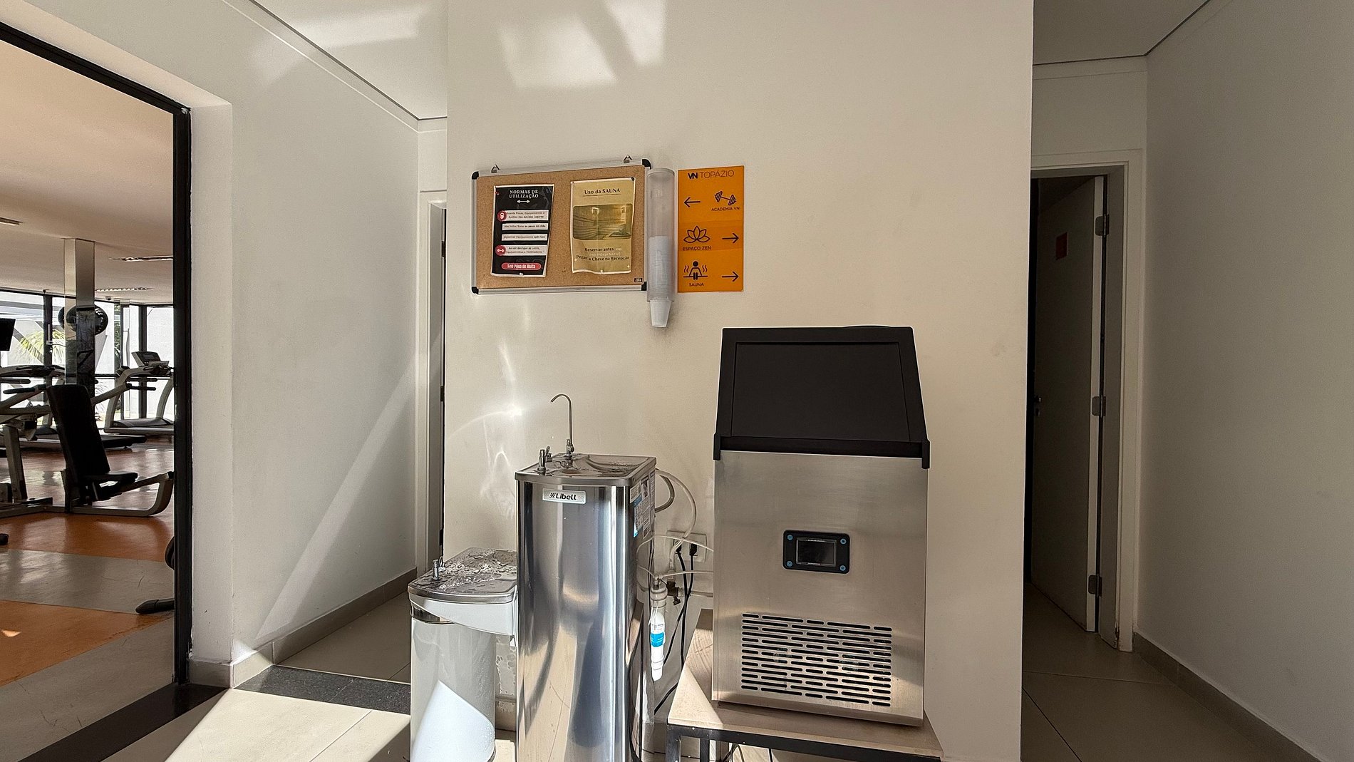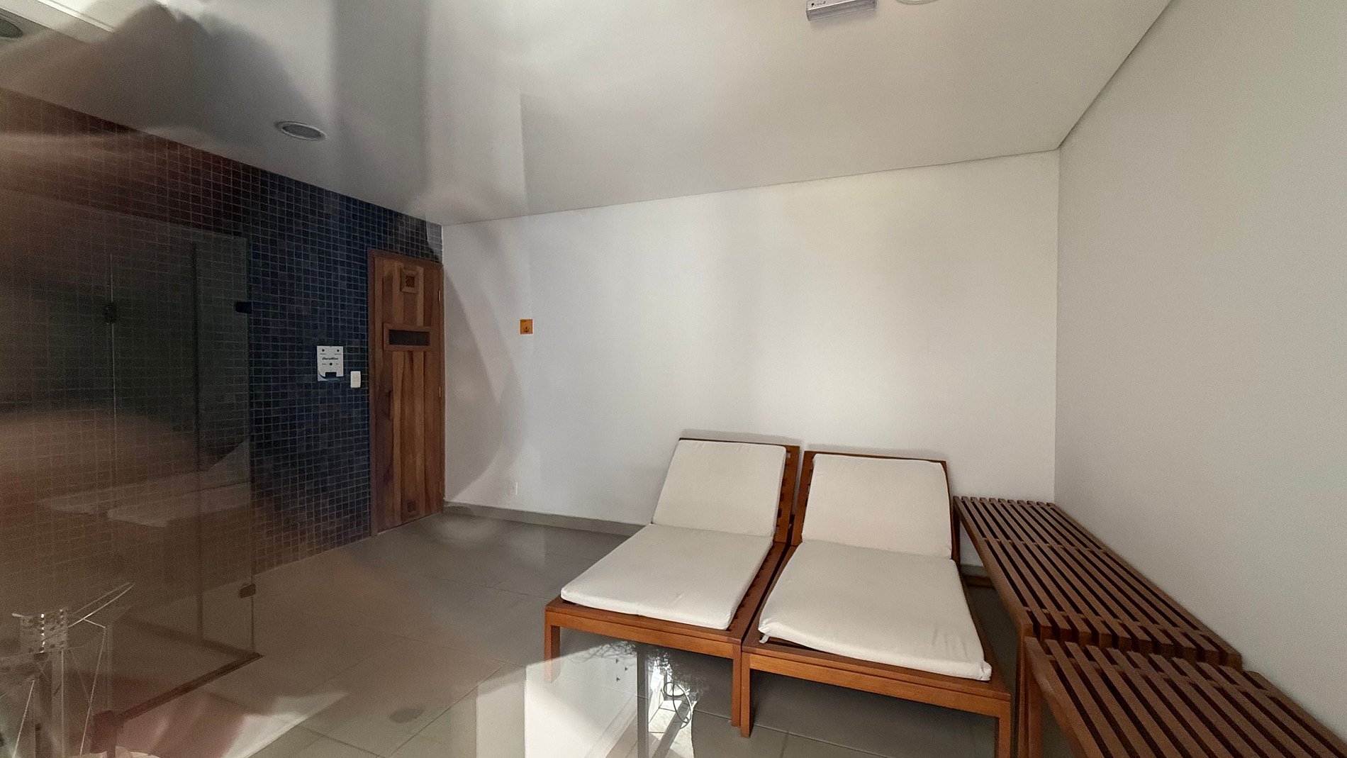 A área externa abriga uma academia completa, equipada com máquinas modernas e janelas amplas com vista para piscina e a parte arborizada do prédio. Mais adiante, a área zen reúne sauna seca, espreguiçadeiras para relaxamento, banheiros, bebedouro e uma prática máquina de gelo, um detalhe simples, mas muito conveniente.
