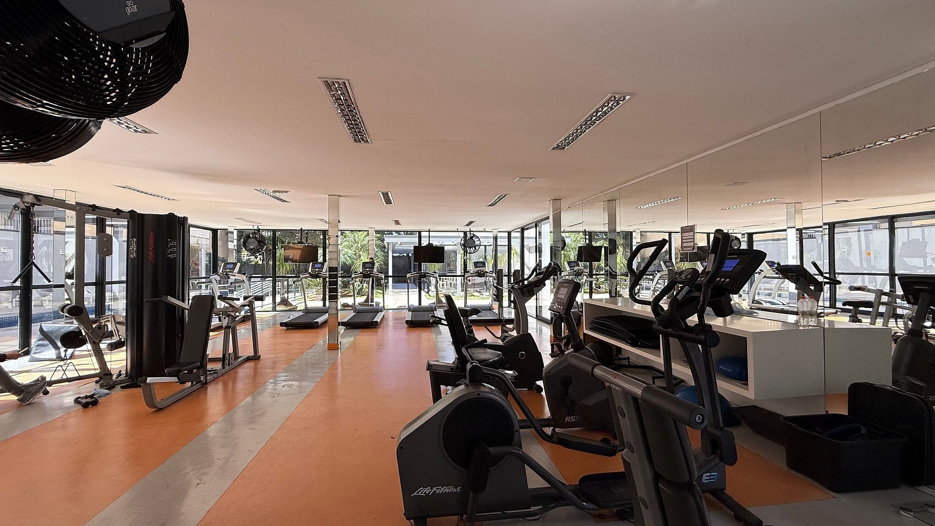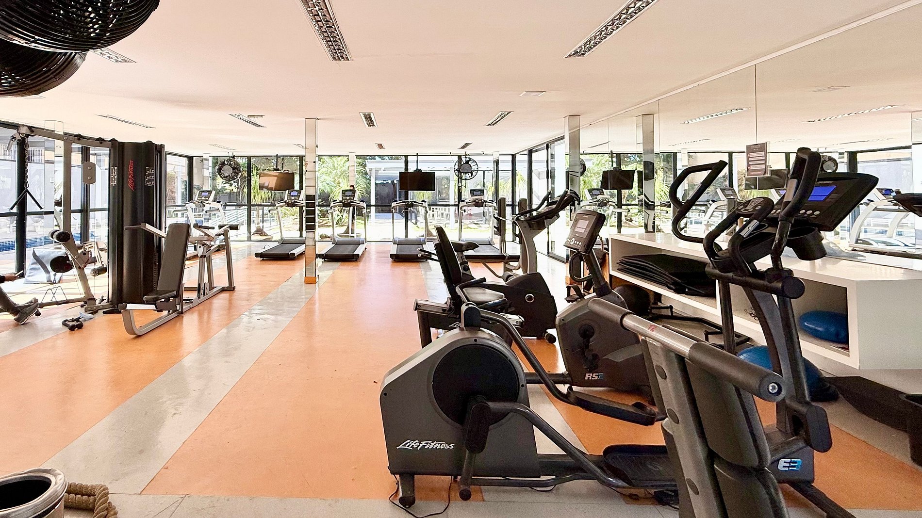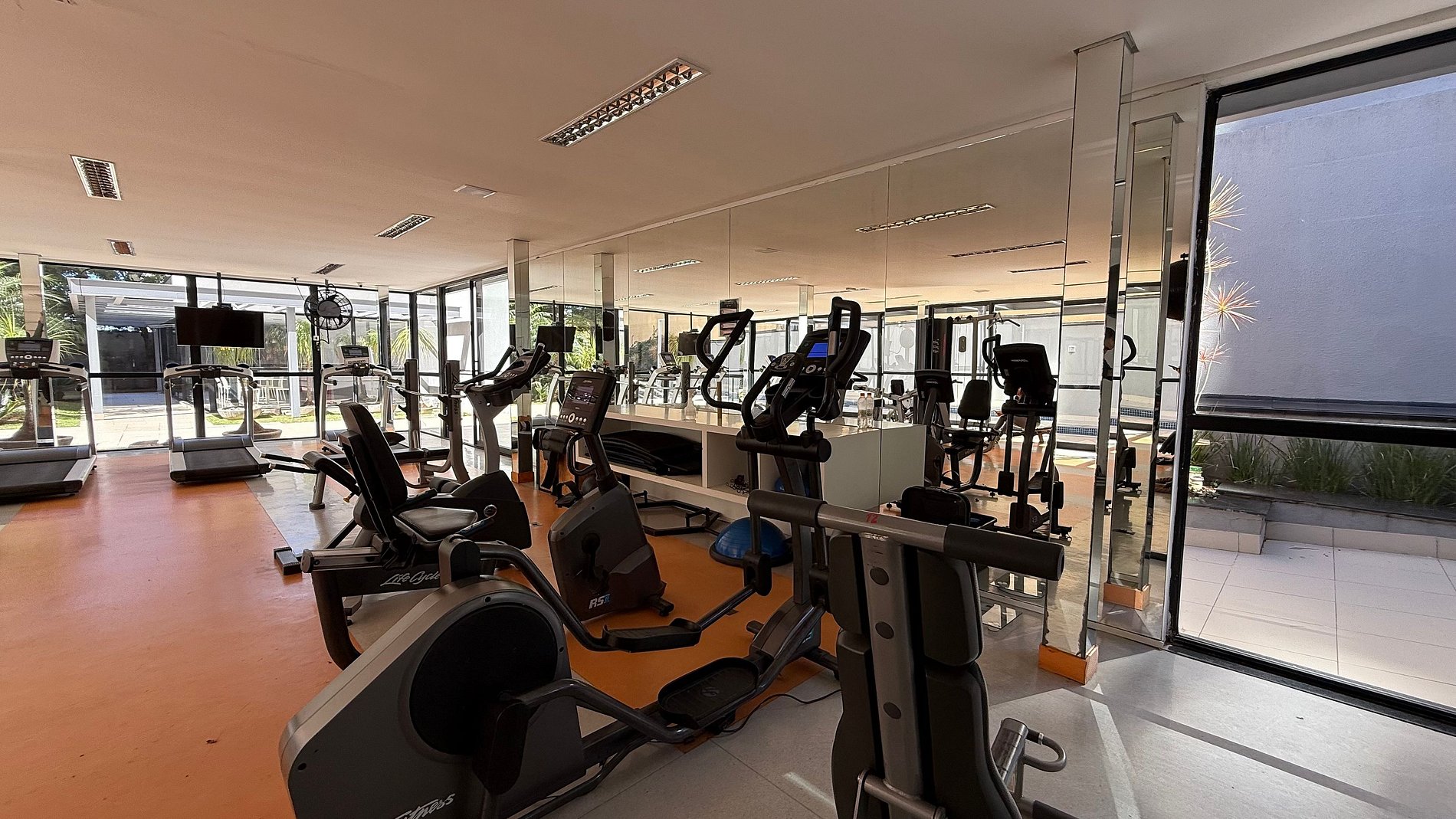A área externa abriga uma academia completa, equipada com máquinas modernas e janelas amplas com vista para piscina e a parte arborizada do prédio. Mais adiante, a área zen reúne sauna seca, espreguiçadeiras para relaxamento, banheiros, bebedouro e uma prática máquina de gelo, um detalhe simples, mas muito conveniente.