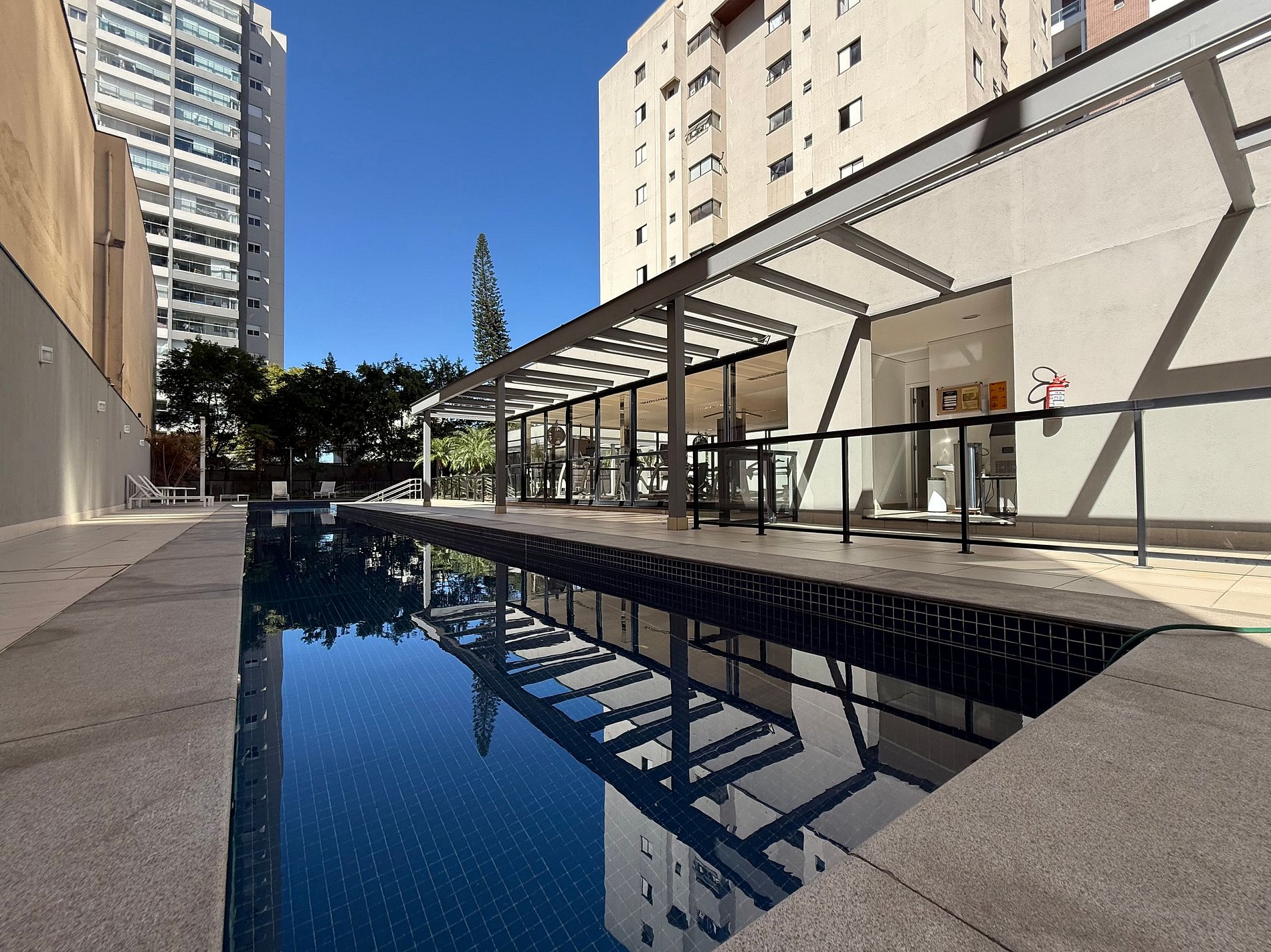 Por fim, a piscina, ampla e convidativa, complementa a estrutura de lazer. Ela recebe boa iluminação natural, com mesas e espreguiçadeiras, torna-se um excelente refúgio para os dias de calor.