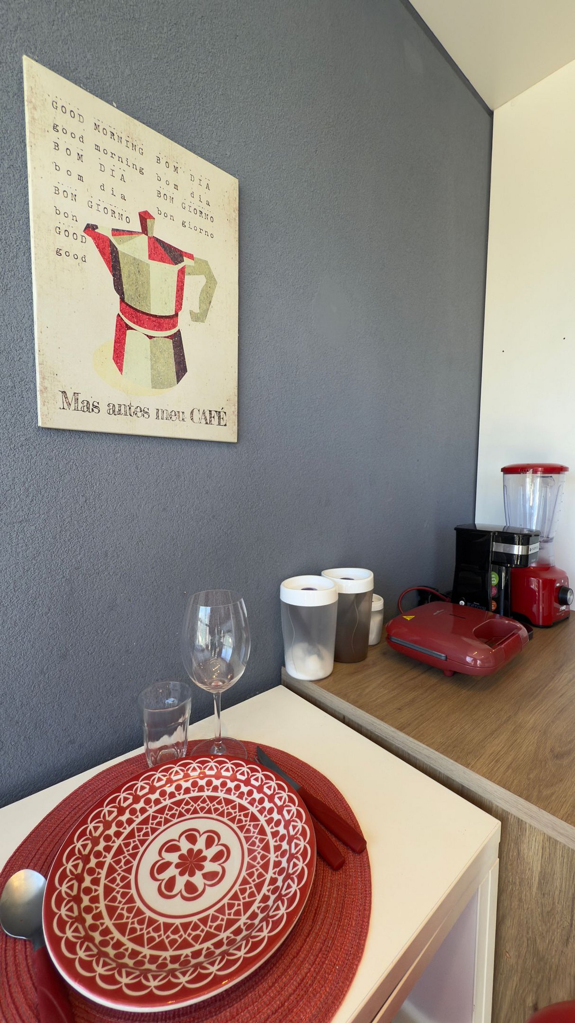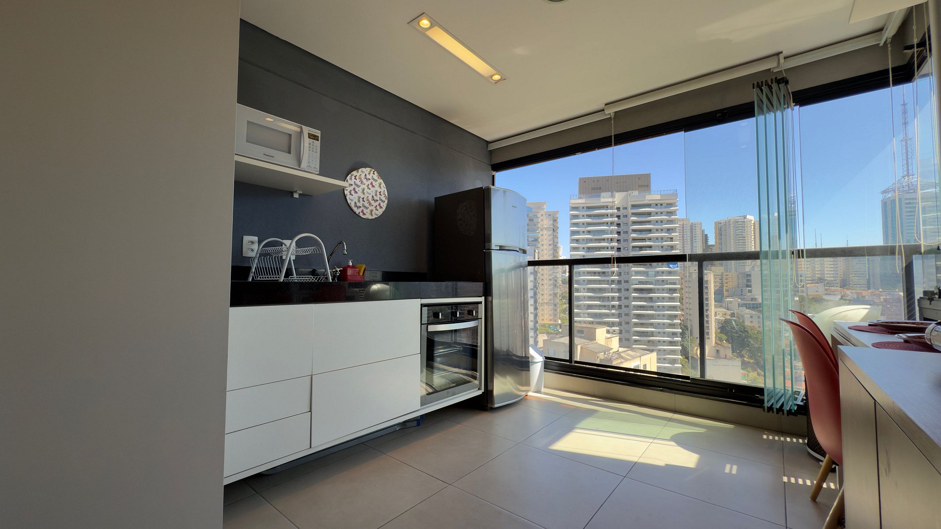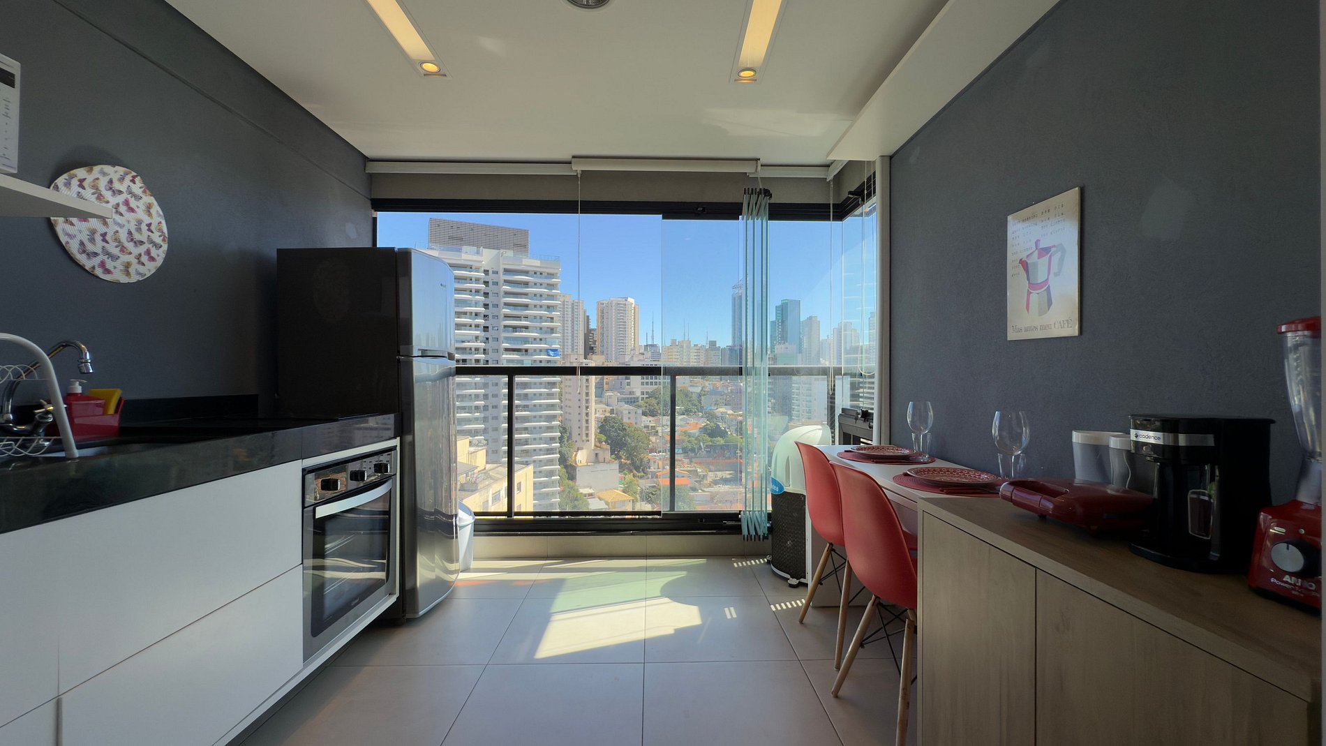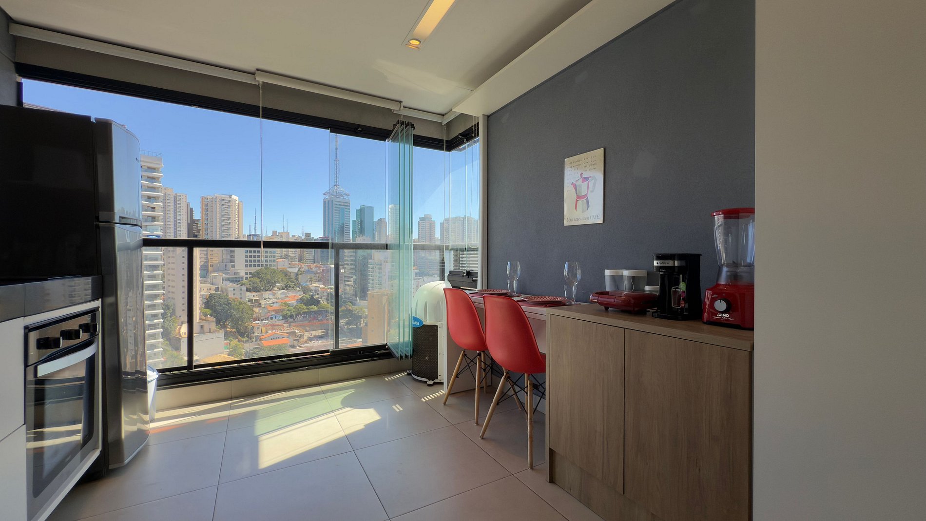 Seguindo em direção à vista, está a cozinha, que combina modernidade e funcionalidade. Geladeira, cooktop, micro-ondas, cafeteira, sanduicheira, liquidificador e utensílios básicos estão à disposição, além de uma mesa prática para refeições rápidas ou cafés tranquilos com a cidade ao fundo. Itens como pó de café e açúcar já estão no local, para você começar o dia do jeito certo.