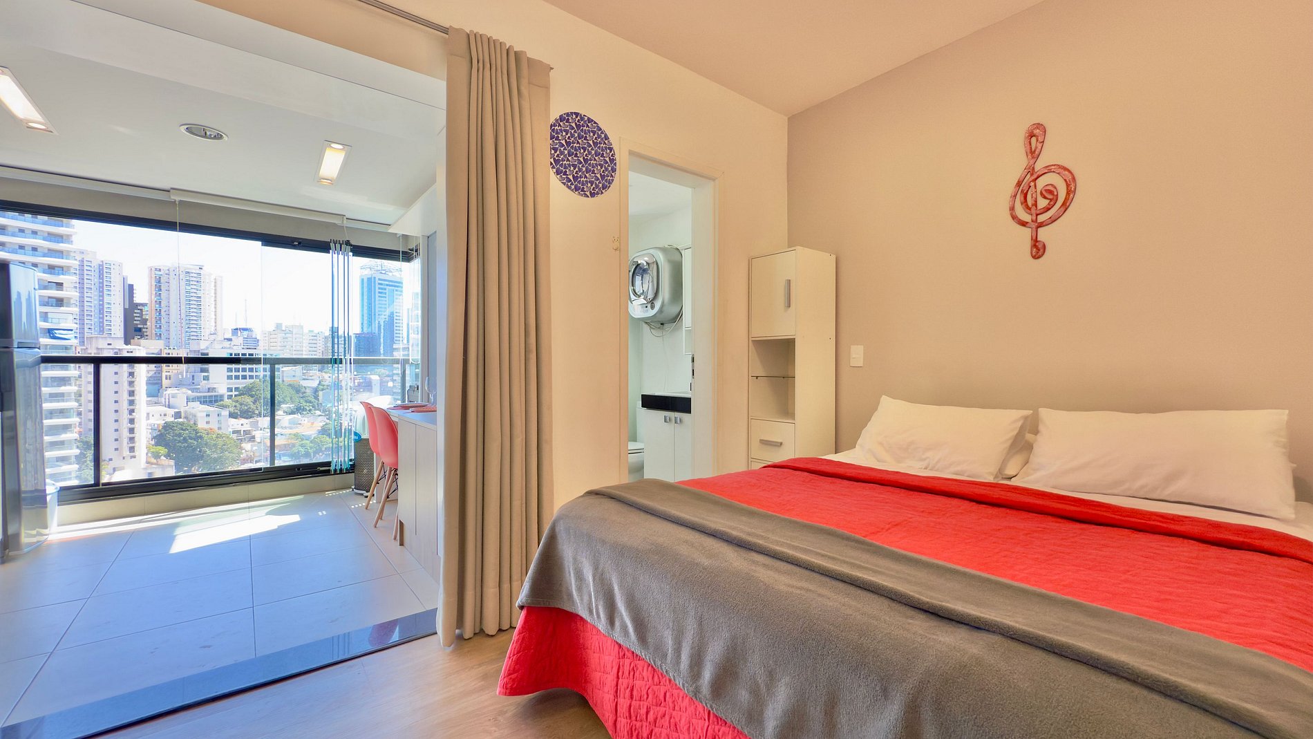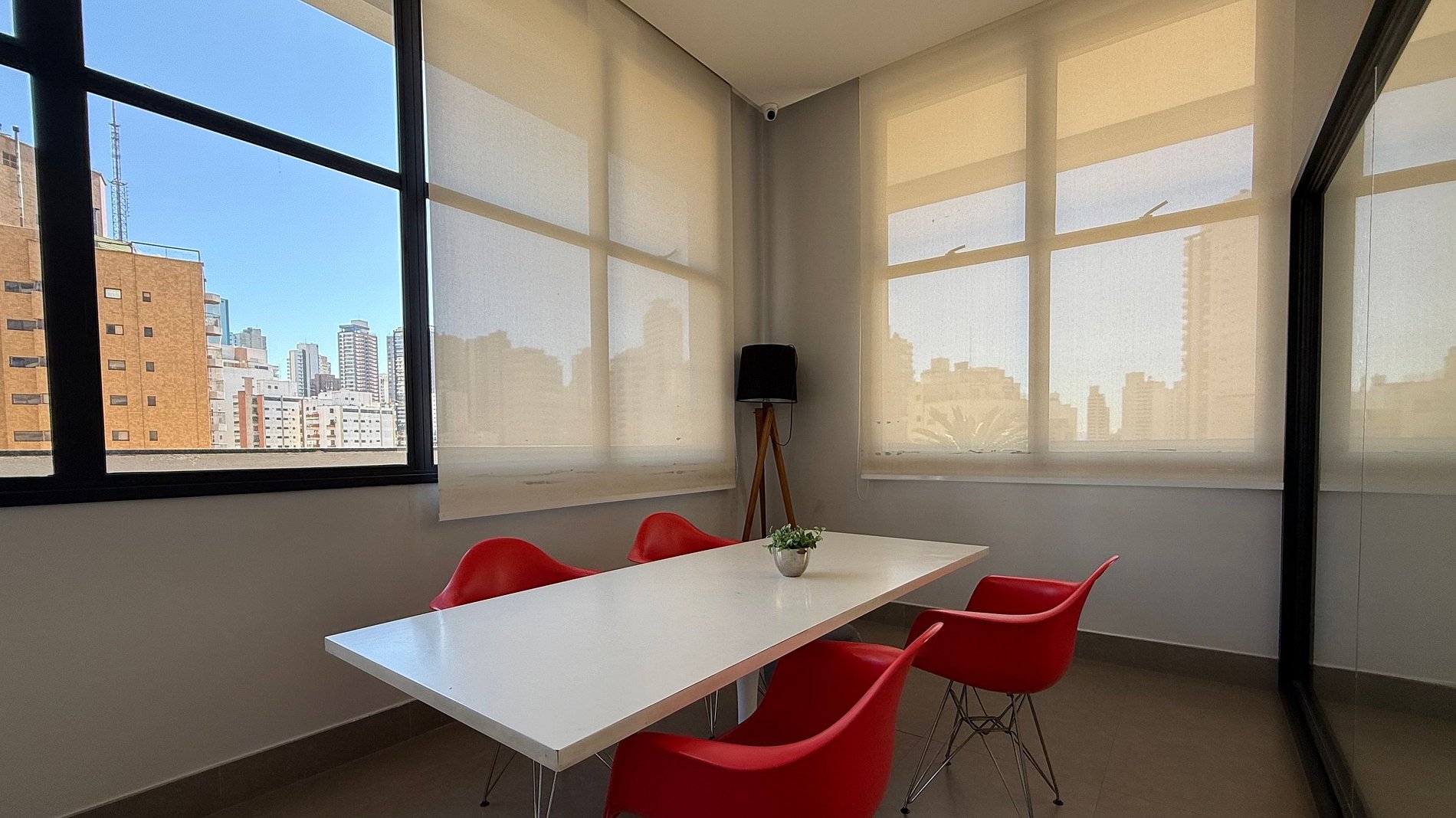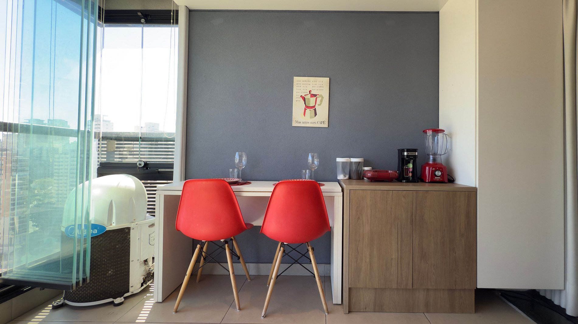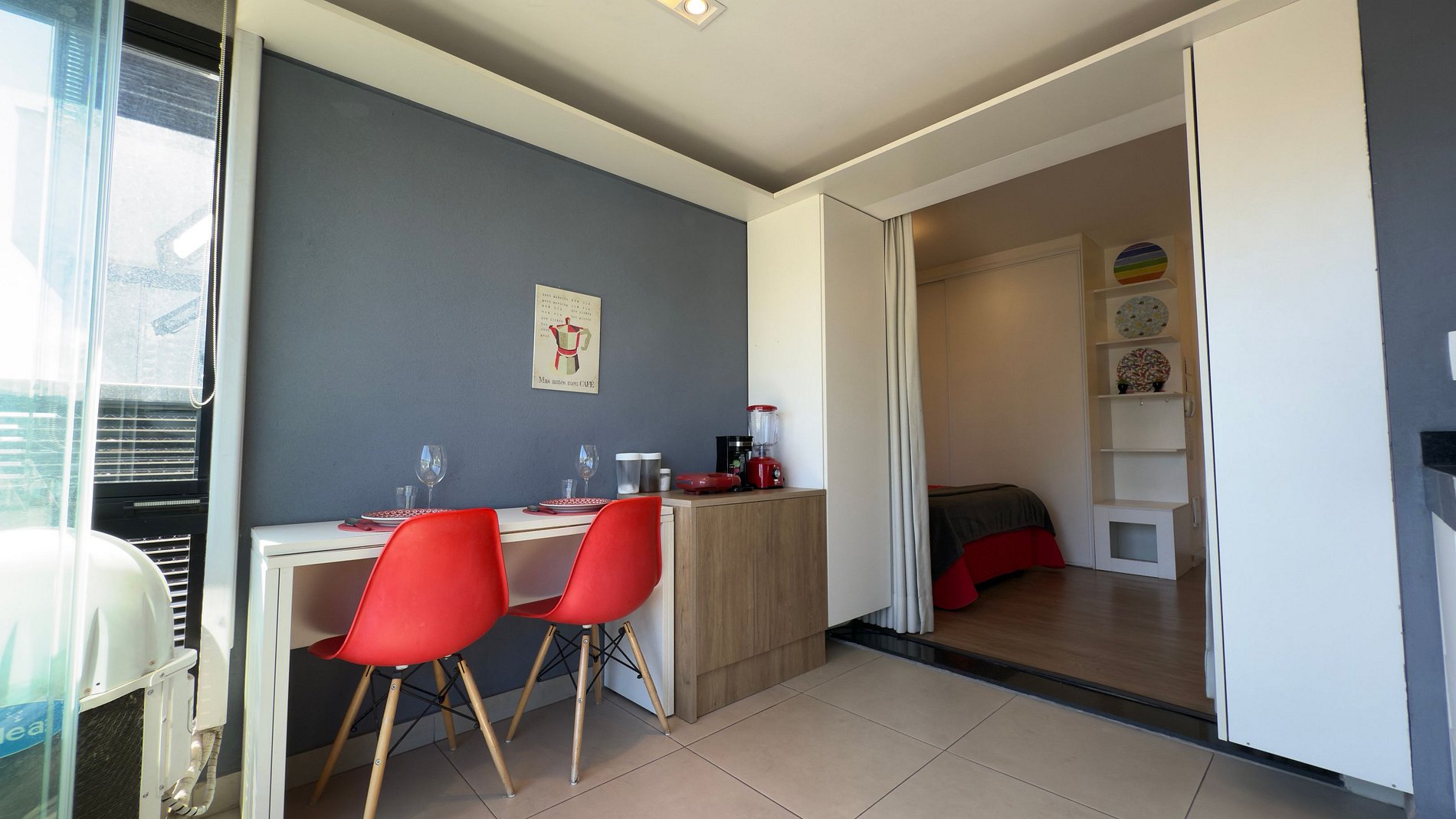 Seguindo em direção à vista, está a cozinha, que combina modernidade e funcionalidade. Geladeira, cooktop, micro-ondas, cafeteira, sanduicheira, liquidificador e utensílios básicos estão à disposição, além de uma mesa prática para refeições rápidas ou cafés tranquilos com a cidade ao fundo. Itens como pó de café e açúcar já estão no local, para você começar o dia do jeito certo.