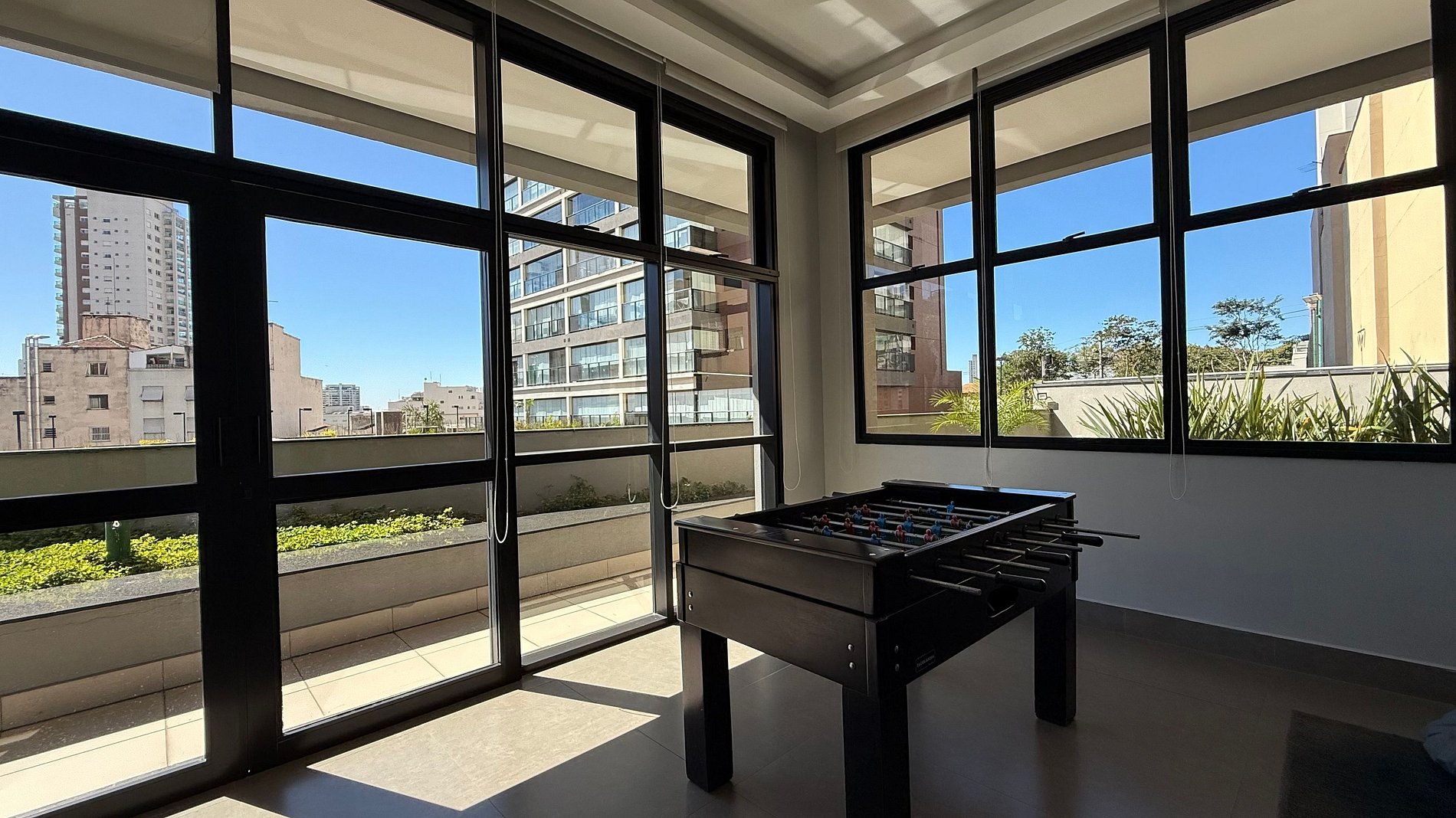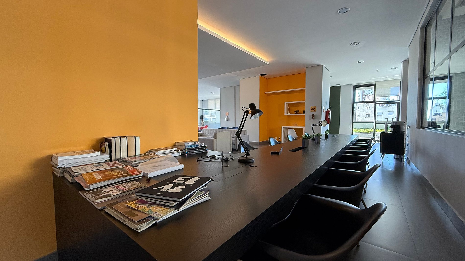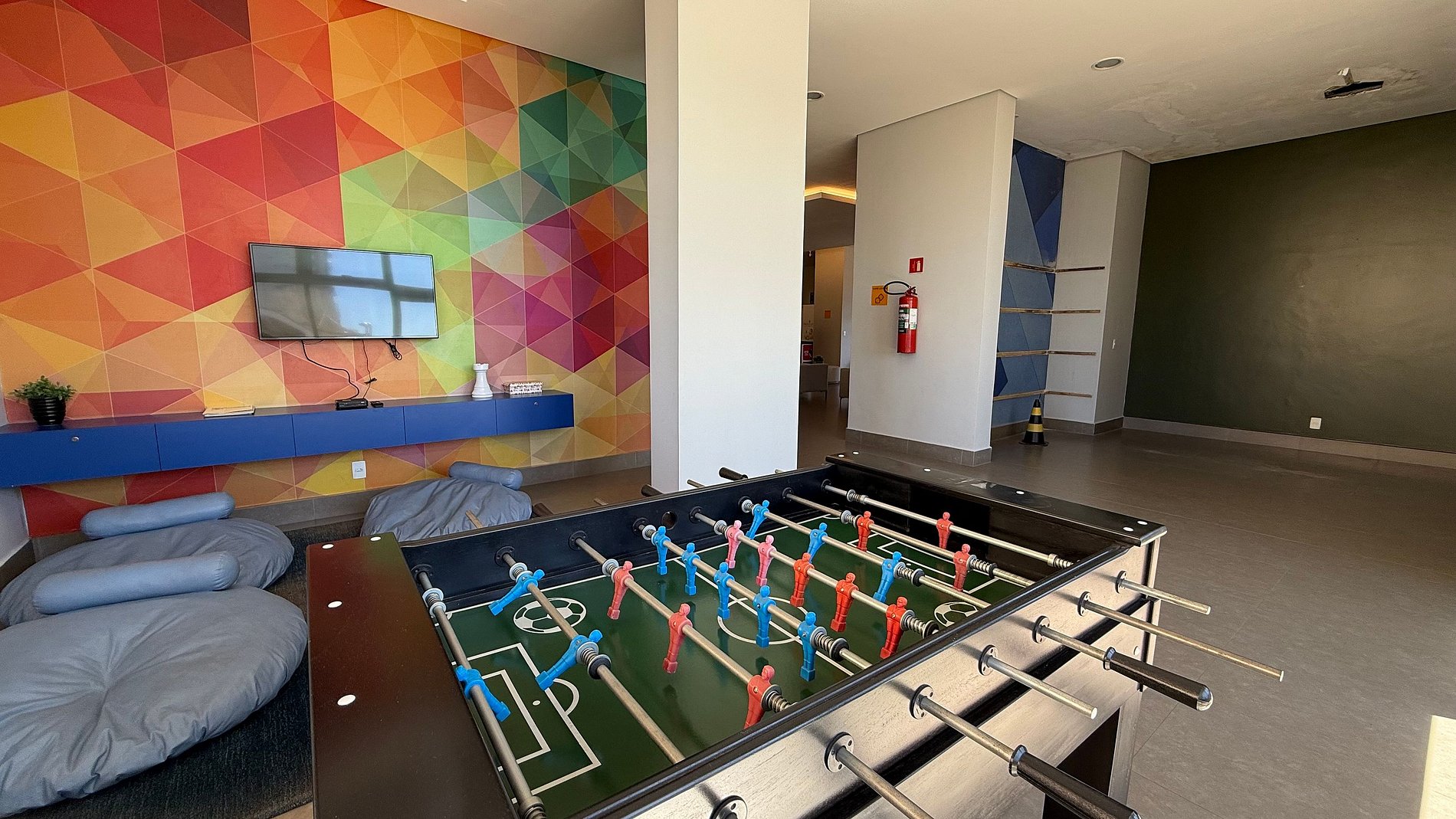 Há também mesa de pebolim, uma sala de TV com pufes, e um excelente coworking com mesa ampla, tomadas, cafeteira, bebedouro e sala de reunião anexa, perfeito para quem precisa trabalhar remotamente ou ter reuniões com mais privacidade.