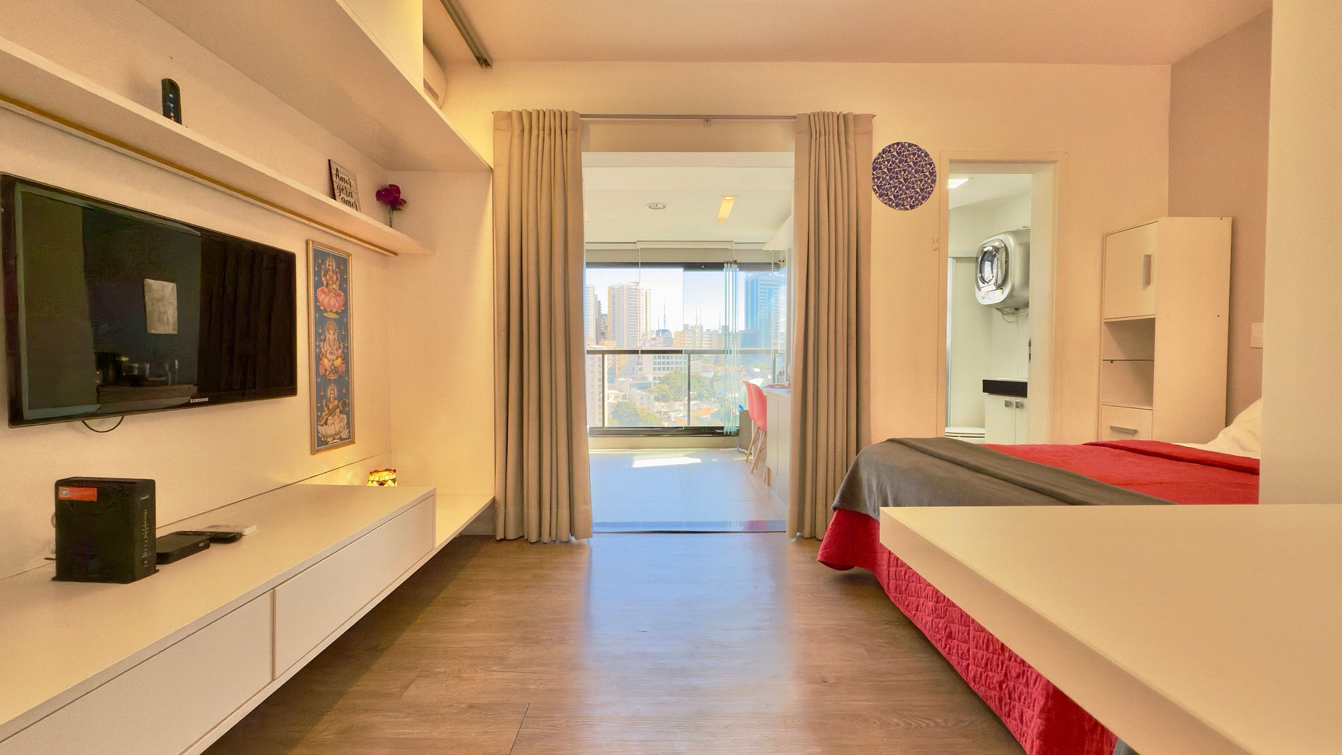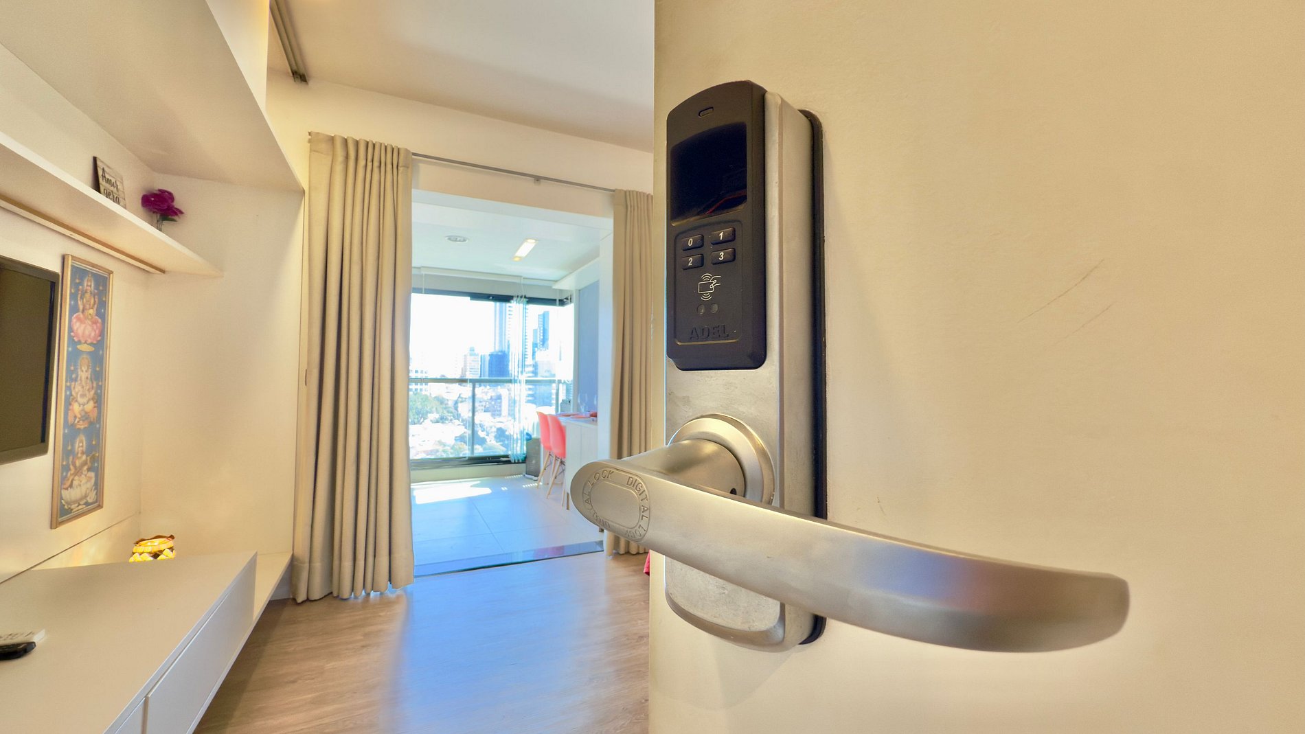 O elevador moderno leva você até o décimo quinto andar, onde o silêncio já começa a envolver a experiência. Na porta do estúdio, nada de chave: a entrada é feita por fechadura eletrônica, prática, segura e eficiente.