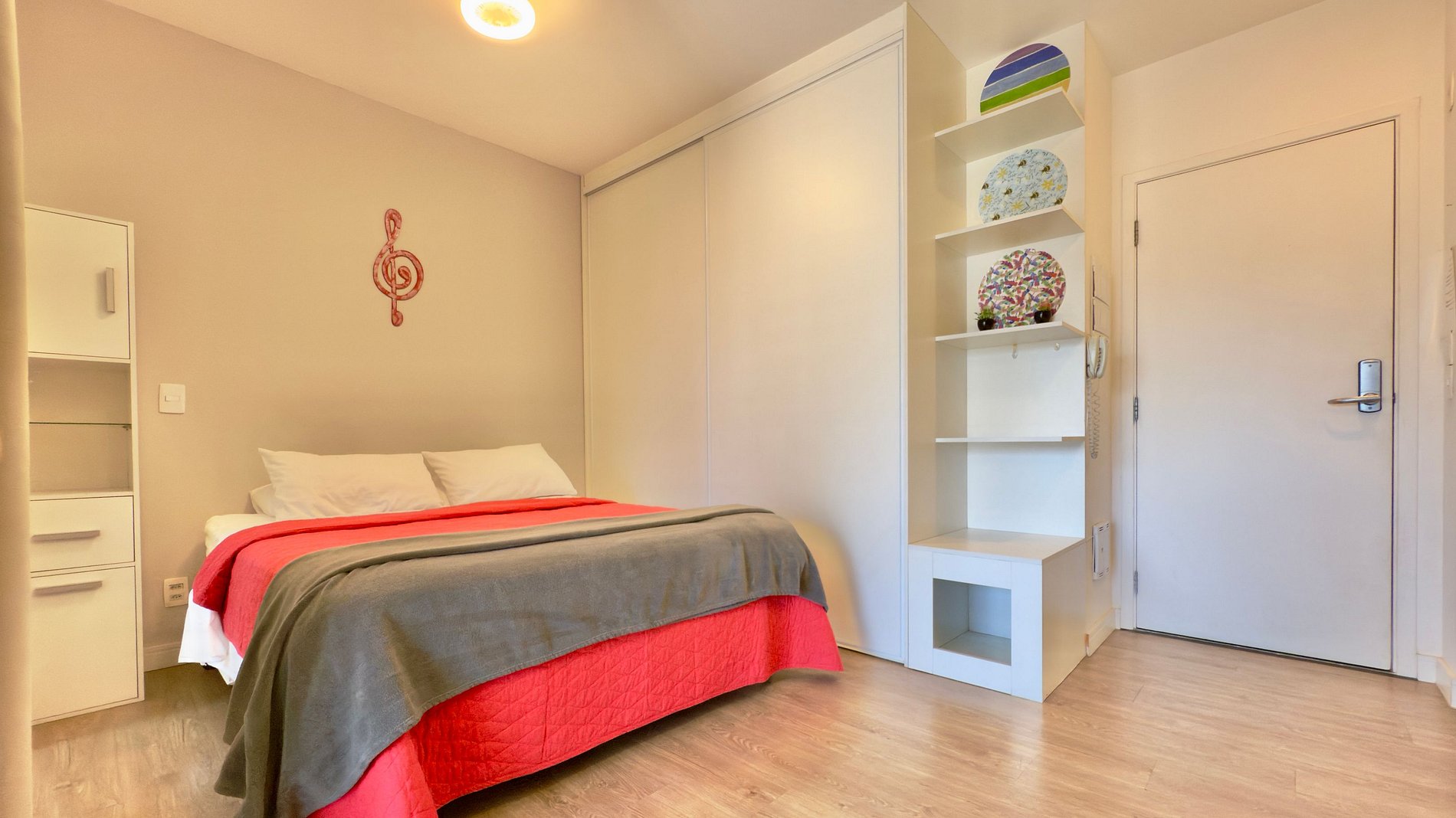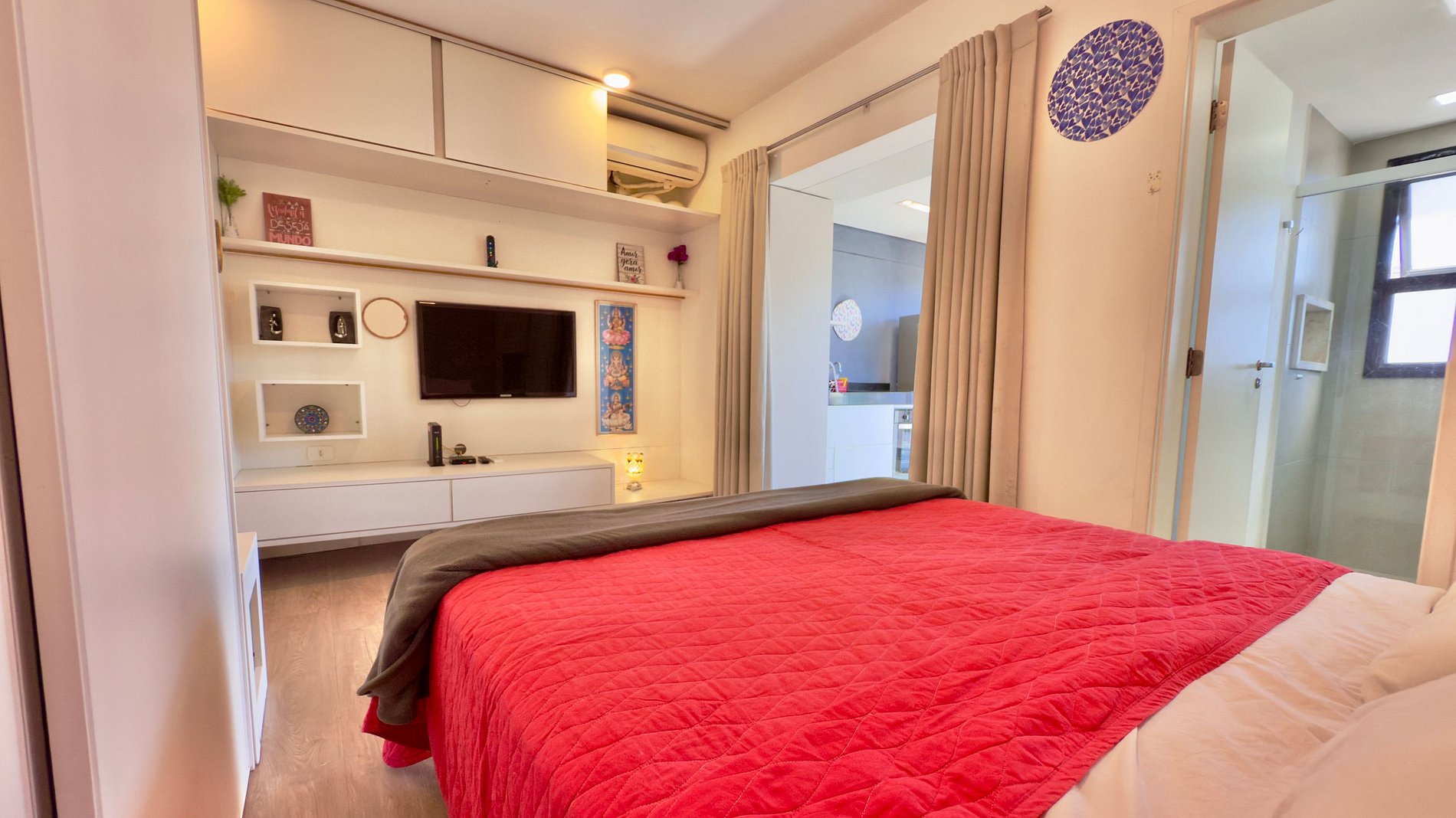 De frente para a cama, a Smart TV já está posicionada para seus momentos de descanso e entretenimento. Você pode se jogar na cama e assistir sua série favorita logo ao chegar.