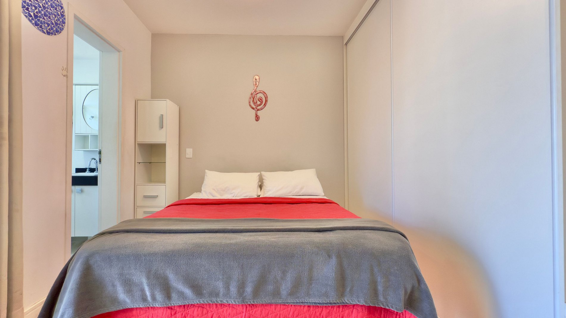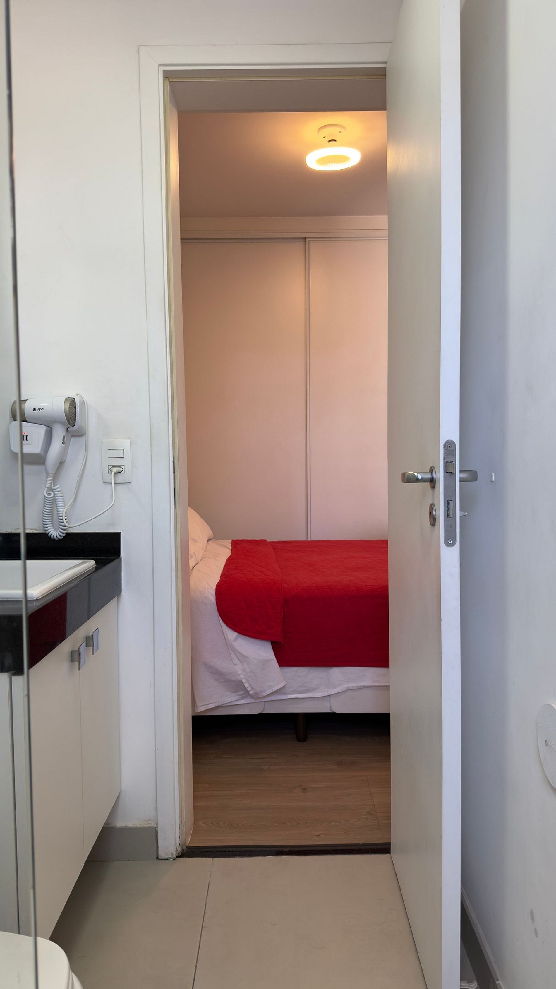O quarto é integrado e aconchegante. A cama de casal recebe o hóspede com enxoval completo, incluindo quatro travesseiros, lençóis macios, cobertor e fronhas limpas. O guarda-roupa espaçoso acomoda malas e roupas com facilidade, e conta também com cabides para peças mais delicadas. Para os dias quentes, o ar-condicionado garante alívio imediato.