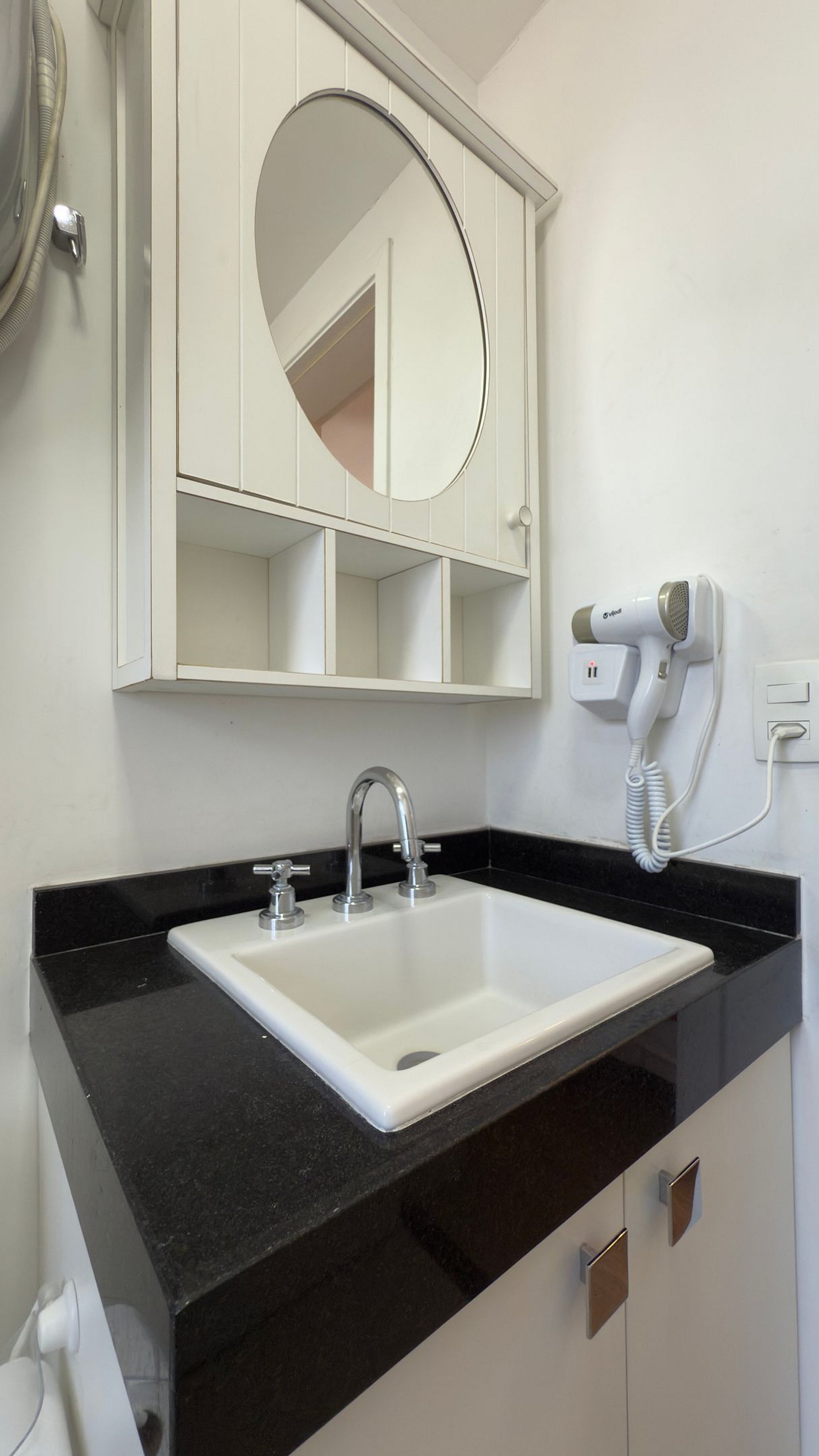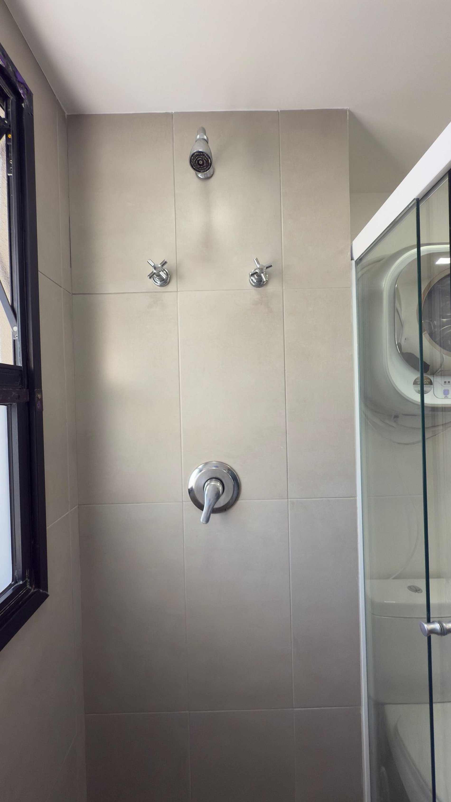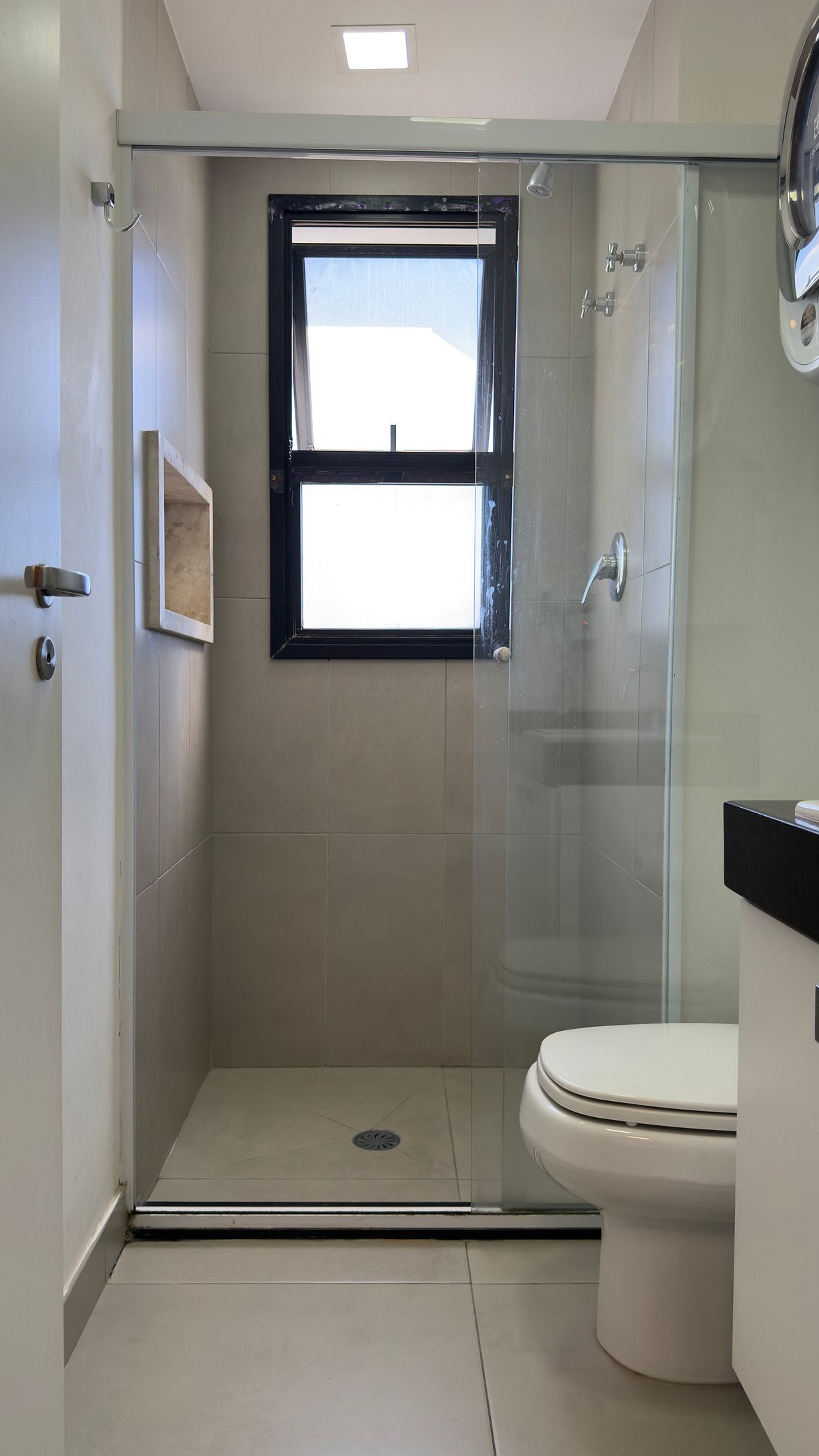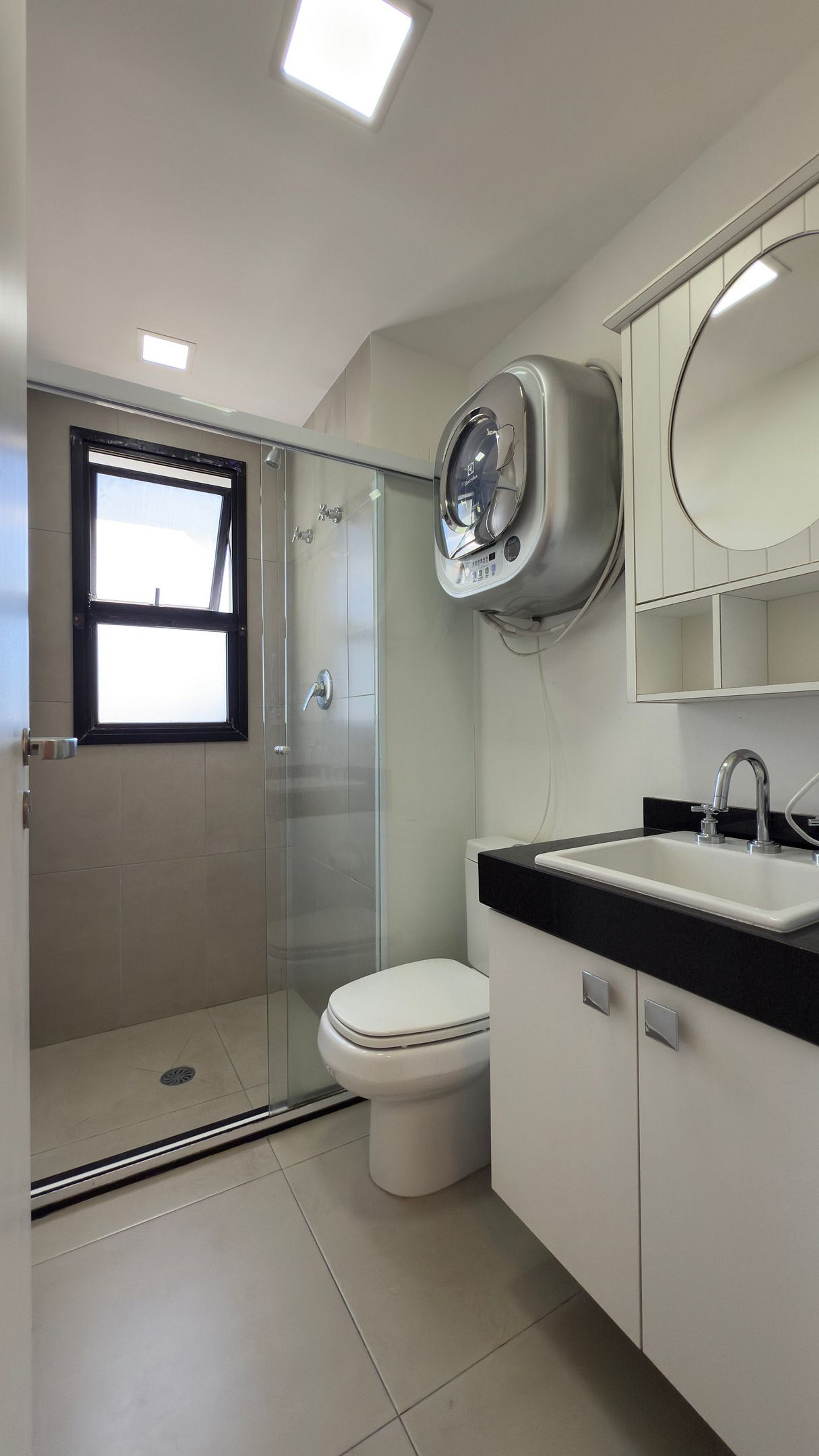 O banheiro é claro, bem ventilado e funcional. O chuveiro com aquecimento a gás oferece banho quente com ótima pressão, perfeito para relaxar depois de um dia intenso. E se precisar lavar roupas, uma lava e seca moderna está instalada no próprio banheiro. Compacta, mas eficiente, permite lavar peças essenciais sem sair do conforto do apartamento.